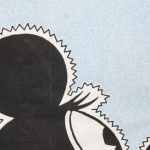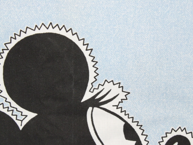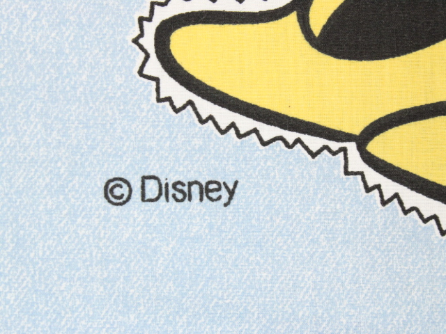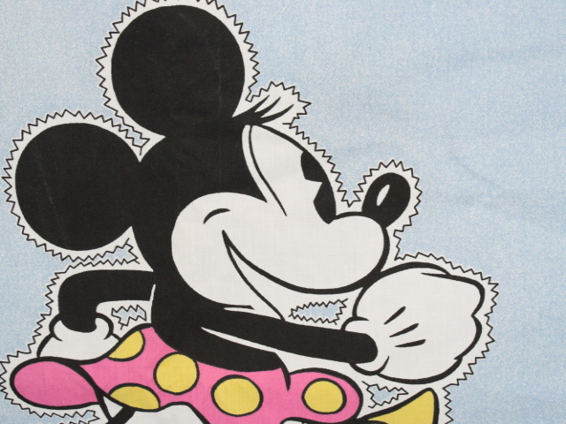 大きなオールドミニーのフラットシーツです。背景は水色のデニム調プリントです。シーツは1枚もの。全体画像(1,2枚)めはそれぞれシーツを2つ折りにして撮影しています。
