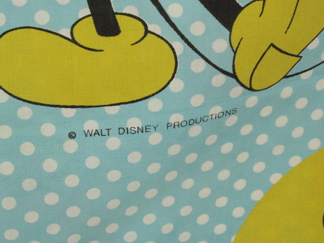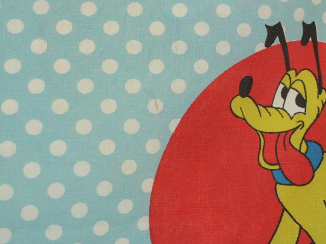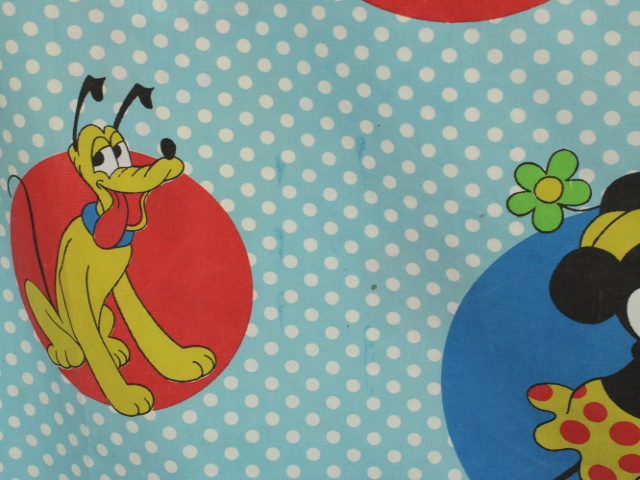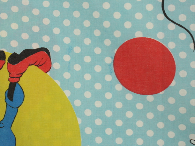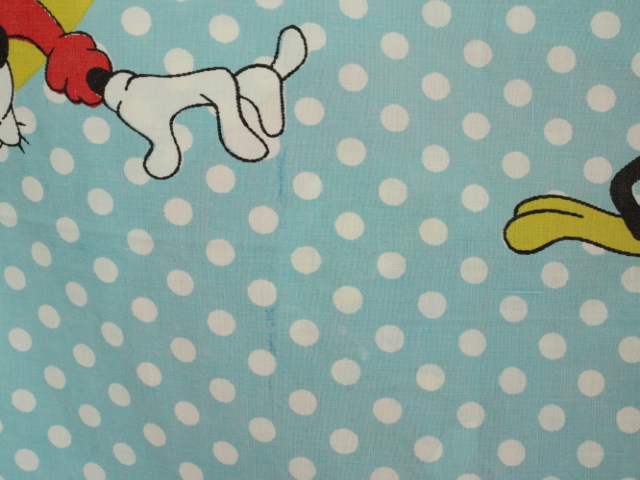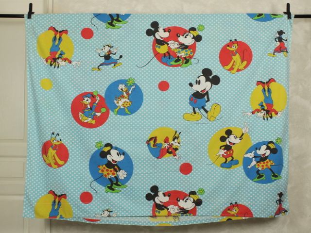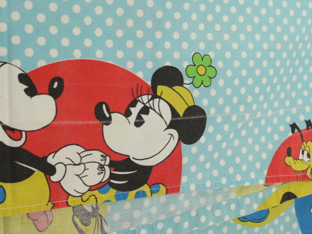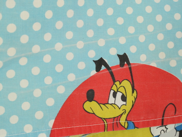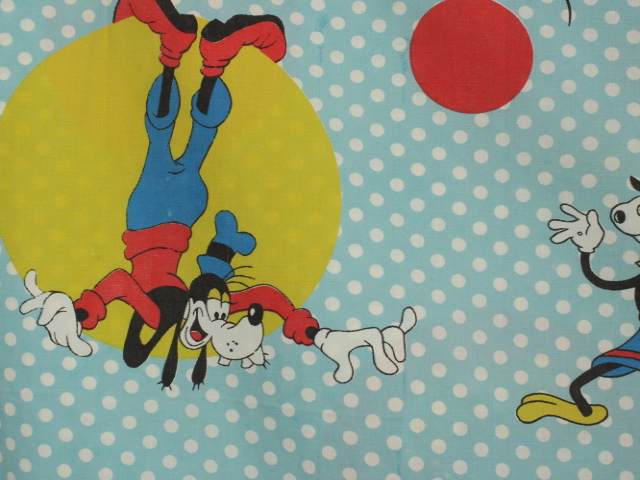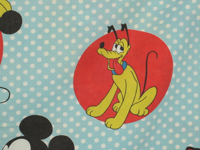 オールドタイプのミッキー&ミニーと仲間たち。カラフルな水玉模様がポップなデザインのフラットシーツです。ドナルド&デイジー、グーフィー、プルート、クララベルのいる楽しげな絵柄です。シーツは1枚もの。画像1、2枚めはそれぞれフラットシーツを2つ折りにして撮影しいます。化繊混じり、目の細かい滑らかな手触りの生地です。