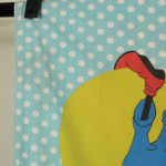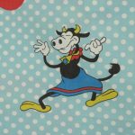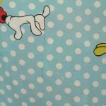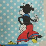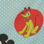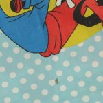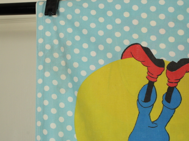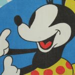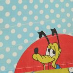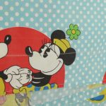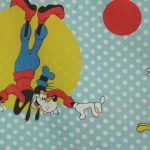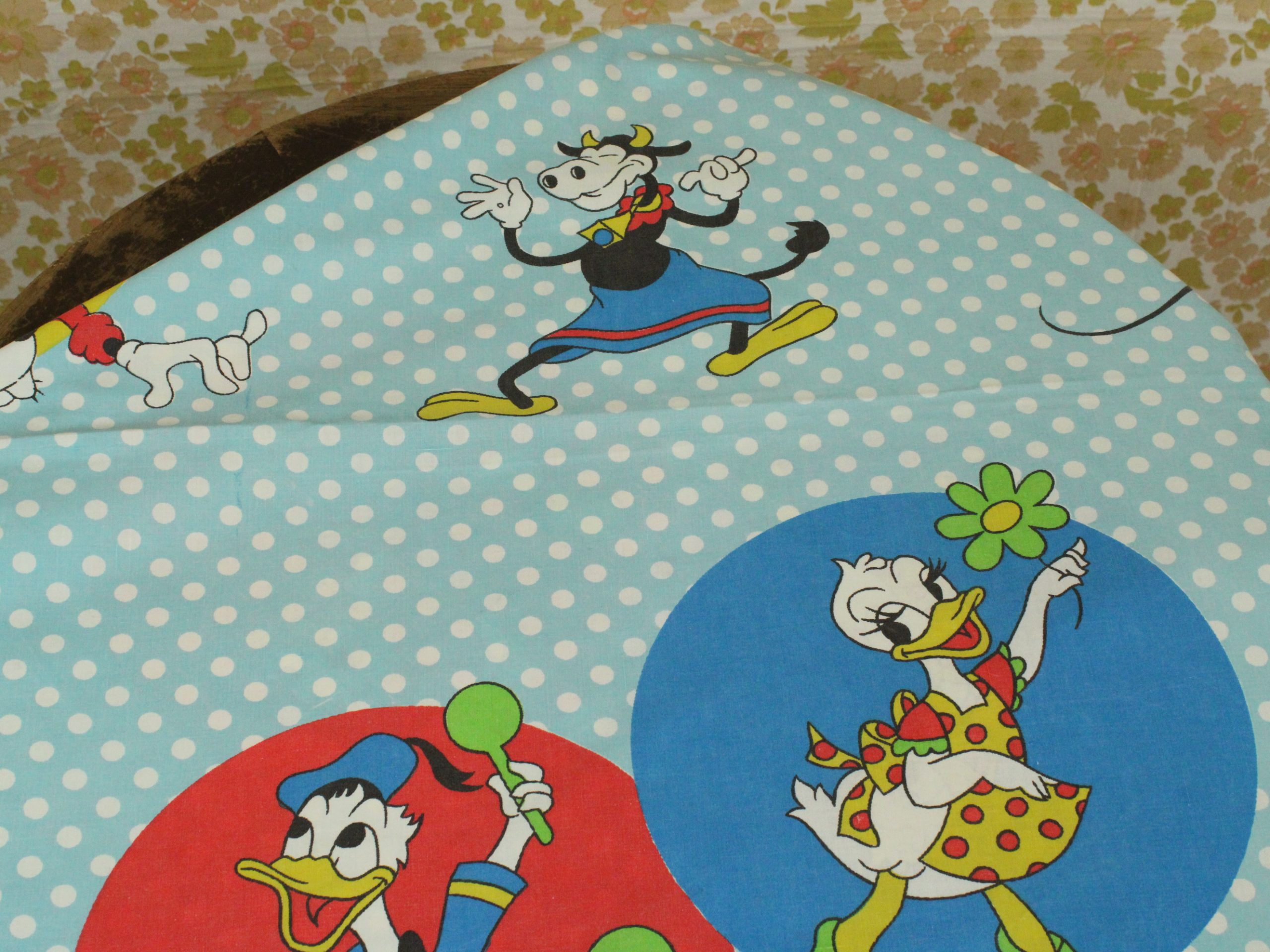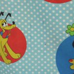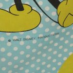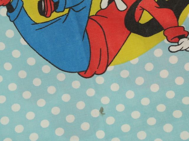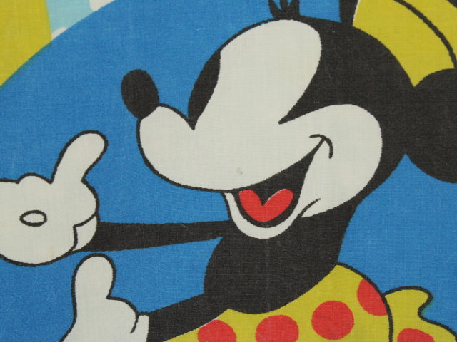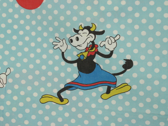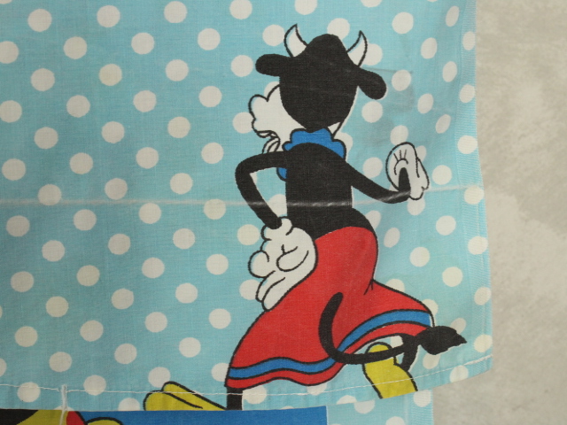 オールドタイプのミッキー&ミニーと仲間たち。カラフルな水玉模様がポップなデザインのフラットシーツです。ドナルド&デイジー、グーフィー、プルート、クララベルのいる楽しげな絵柄です。シーツは1枚もの。画像1、2枚めはそれぞれフラットシーツを2つ折りにして撮影しいます。化繊混じり、目の細かい滑らかな手触りの生地です。