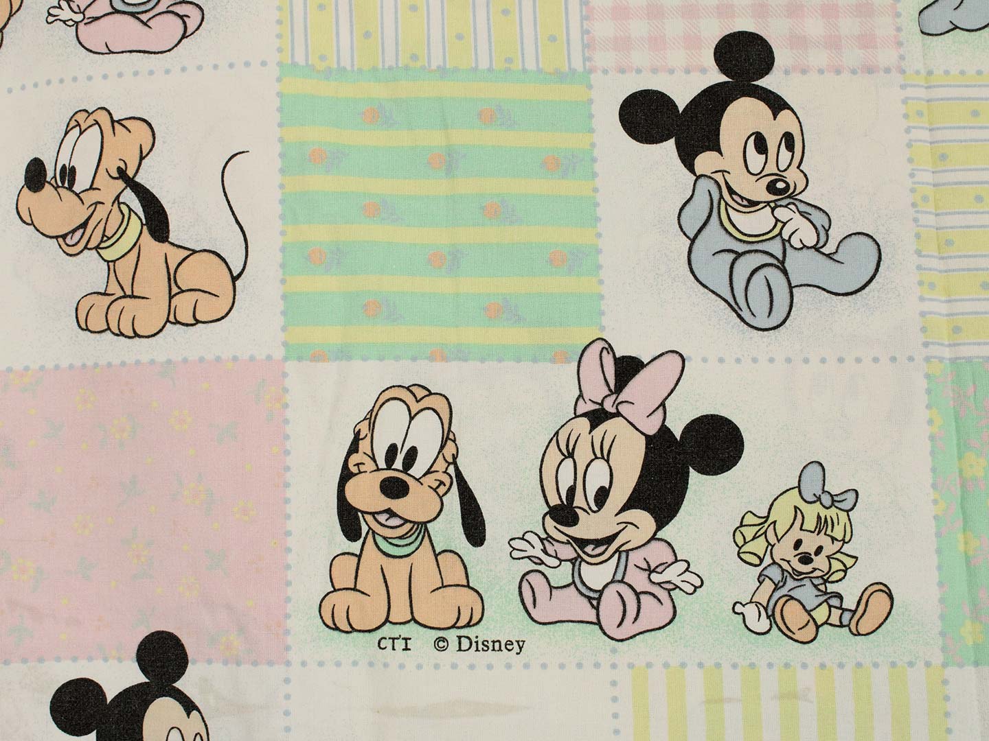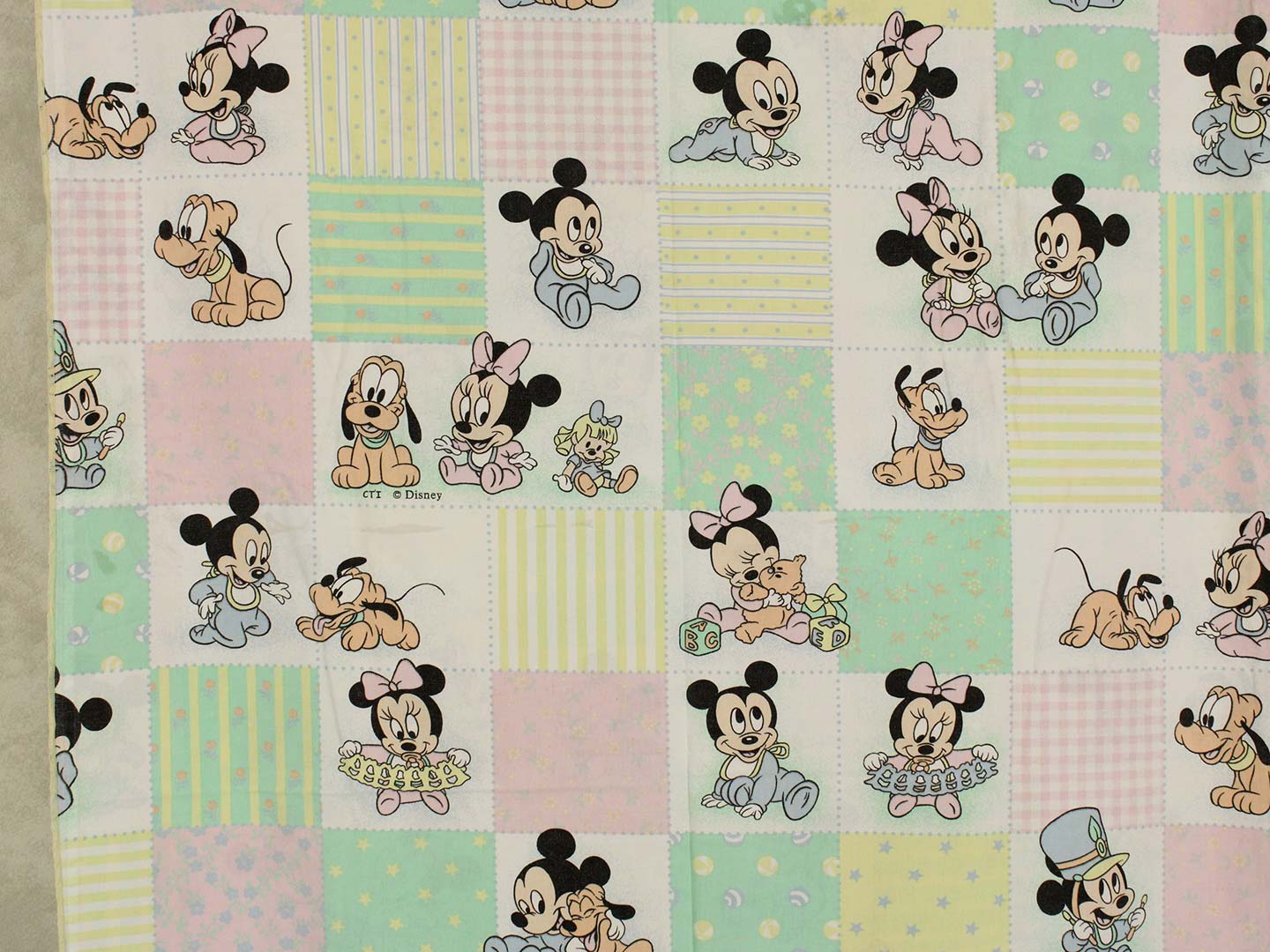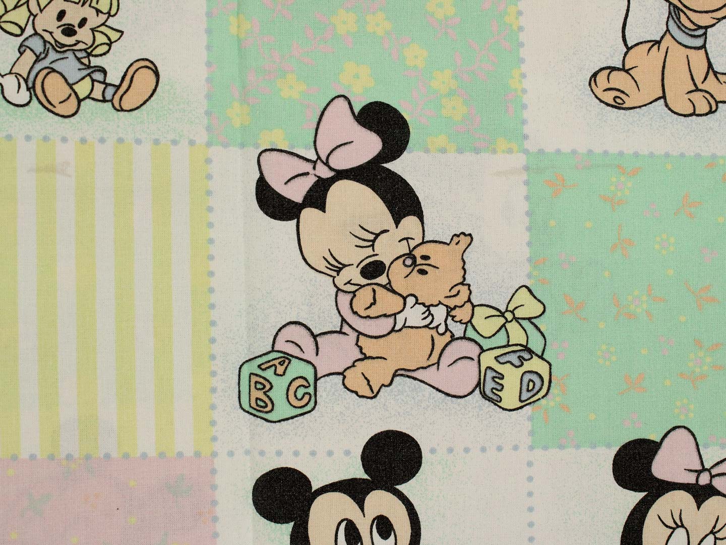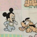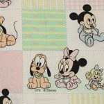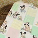 パステルカラーのパッチワーク柄が可愛い、ベビーミッキー&ミニー、プルートのベビーサイズお布団カバーです。お布団カバーは両面同柄です。