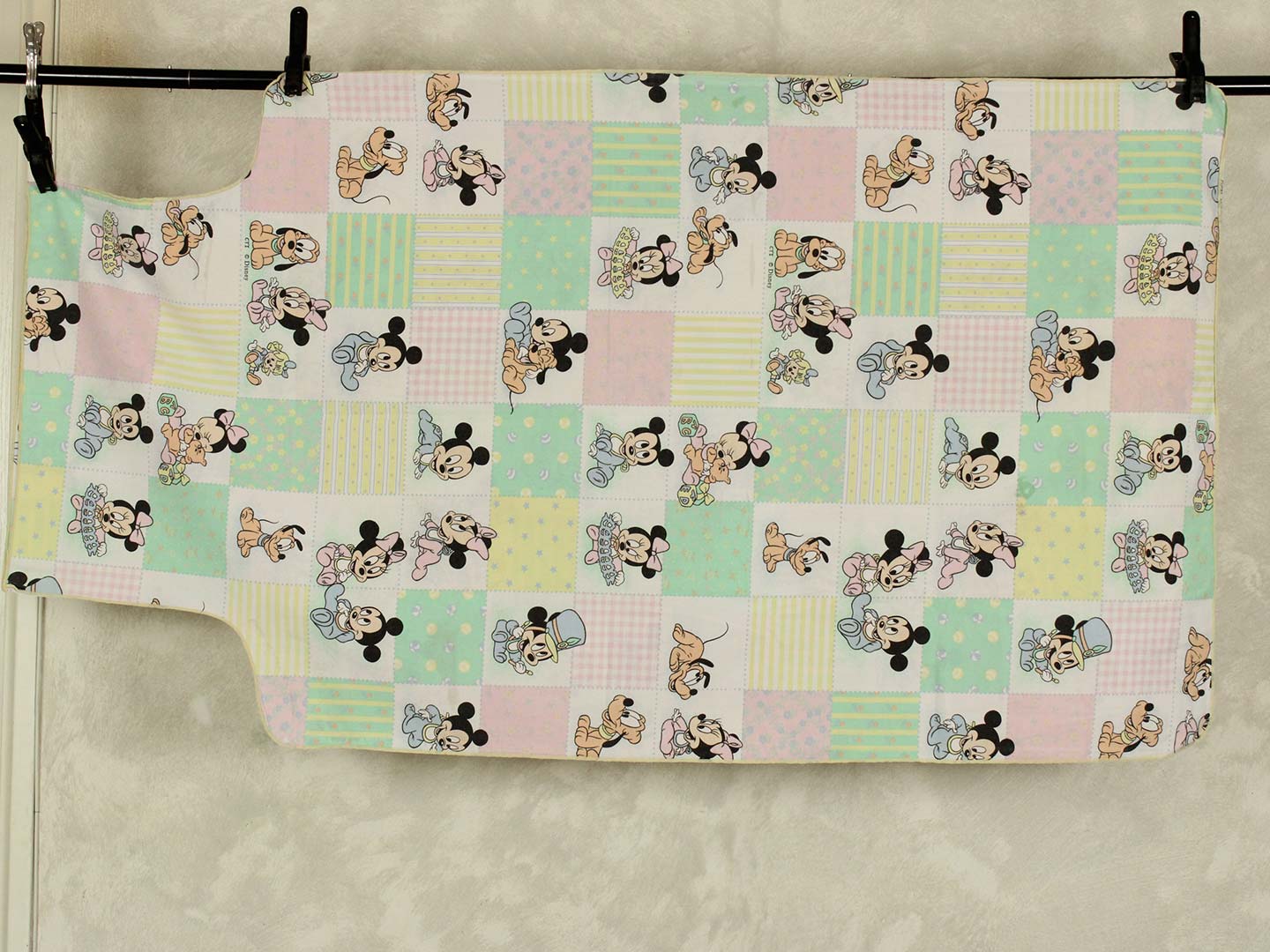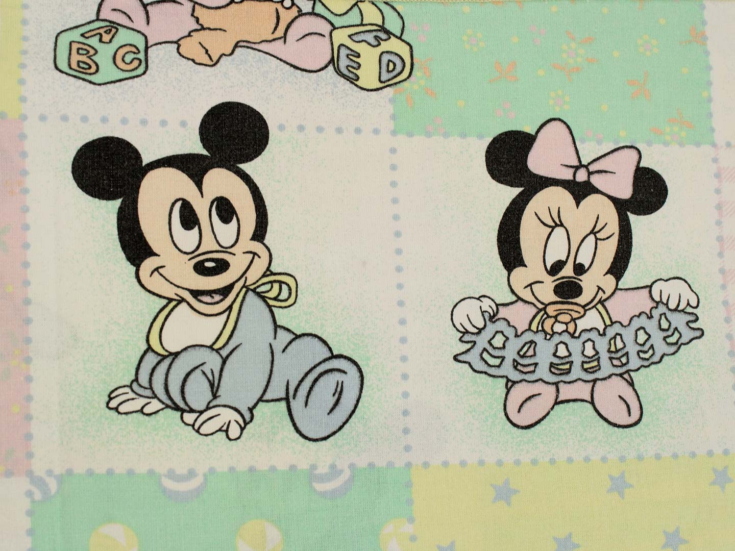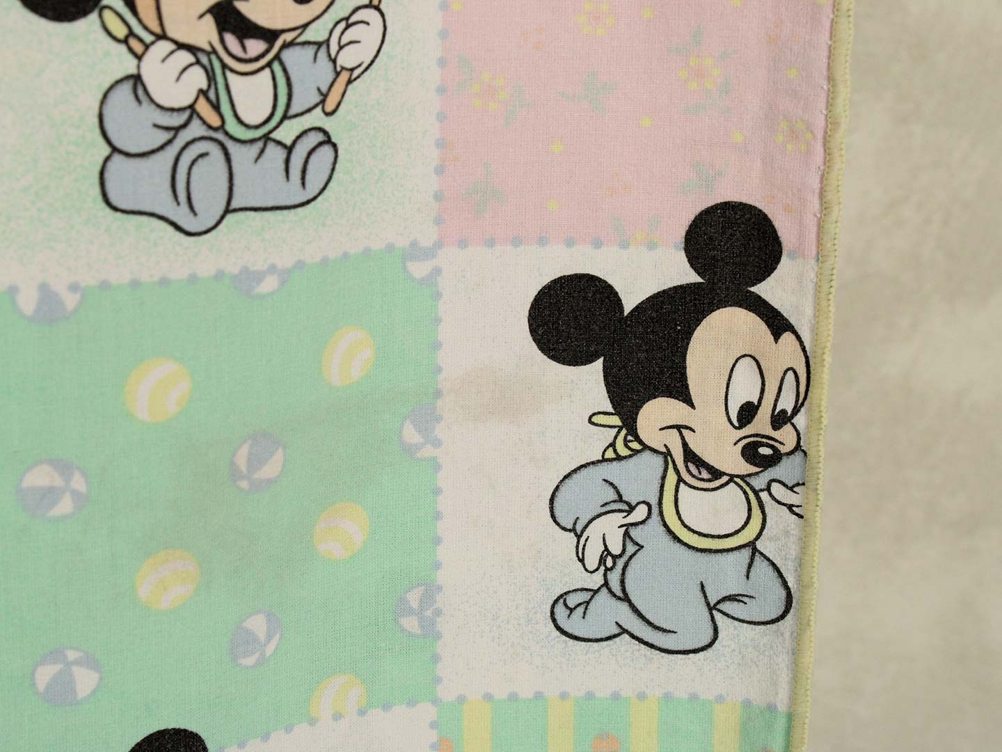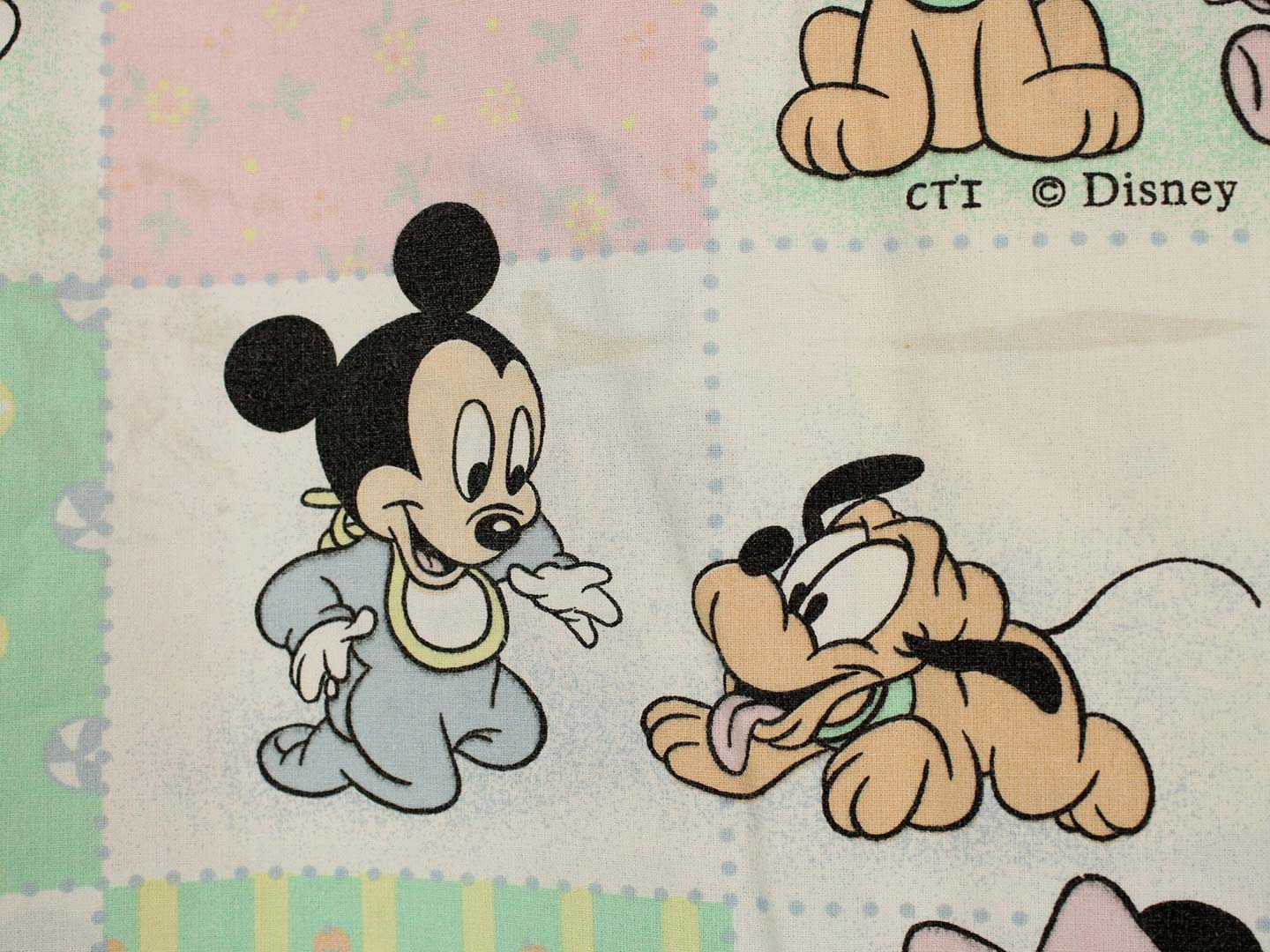 パステルカラーのパッチワーク柄が可愛い、ベビーミッキー&ミニー、プルートのベビーサイズお布団カバーです。お布団カバーは両面同柄です。