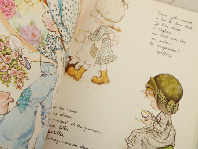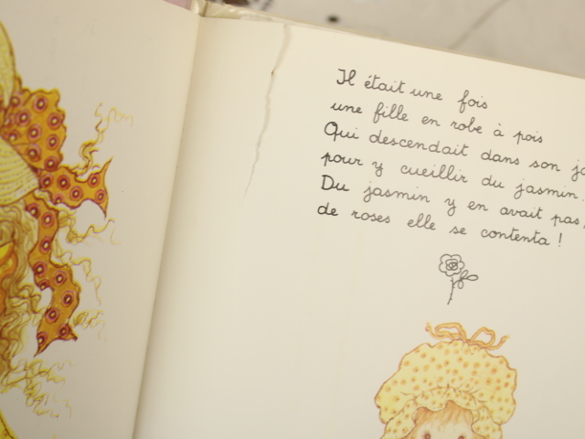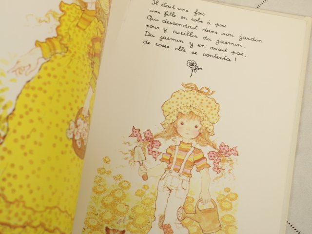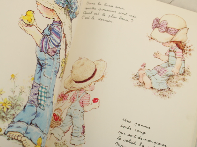 サラ・ケイの世界がぎゅっと詰まったフランス語の絵本、「Petits bonheurs(小さなしあわせ)」です。フランス語独特の韻をふんだ詩的な文章と、美しい挿絵が満載の1冊です。初版は1970年代。フランス語学習、コレクションやディズプレイにいかがでしょうか。