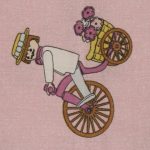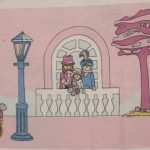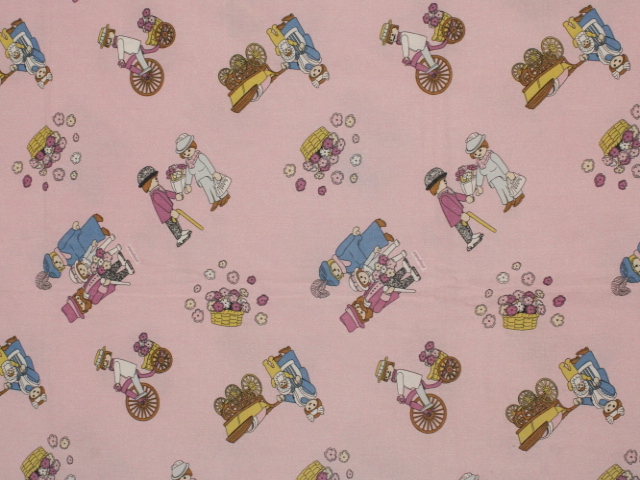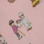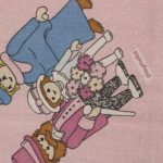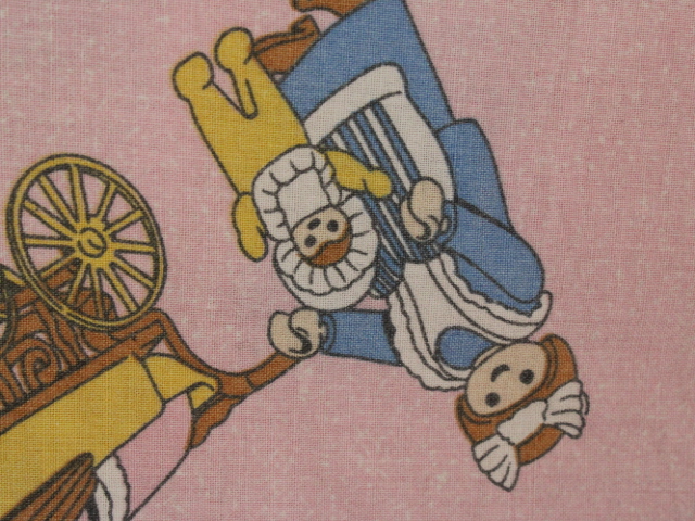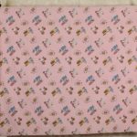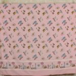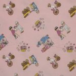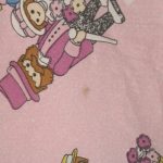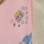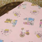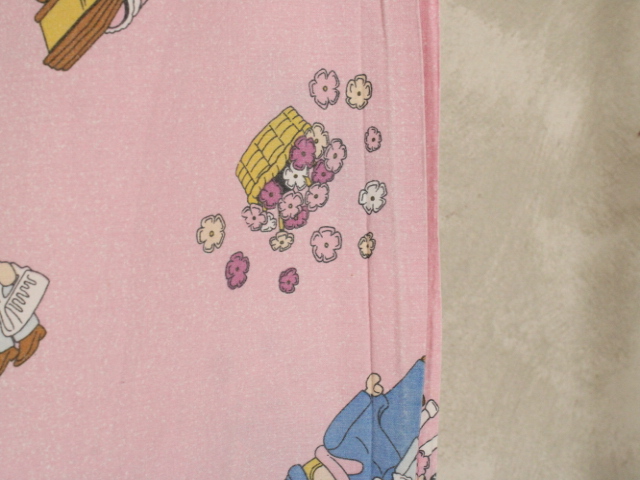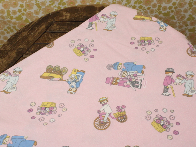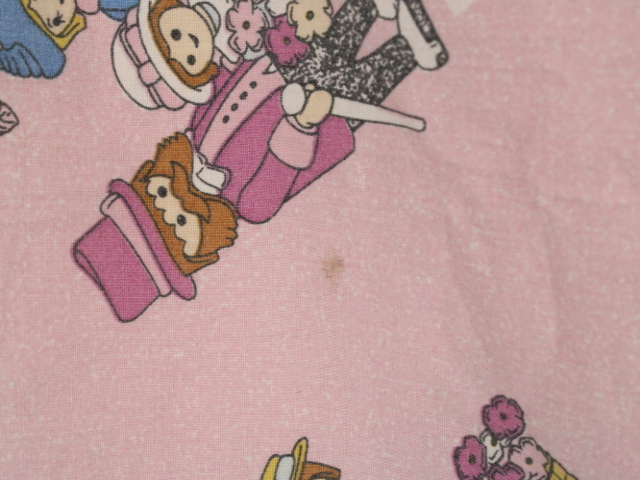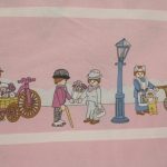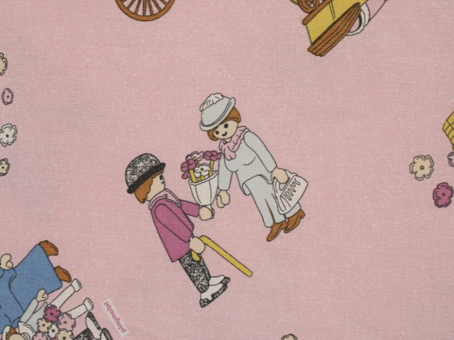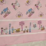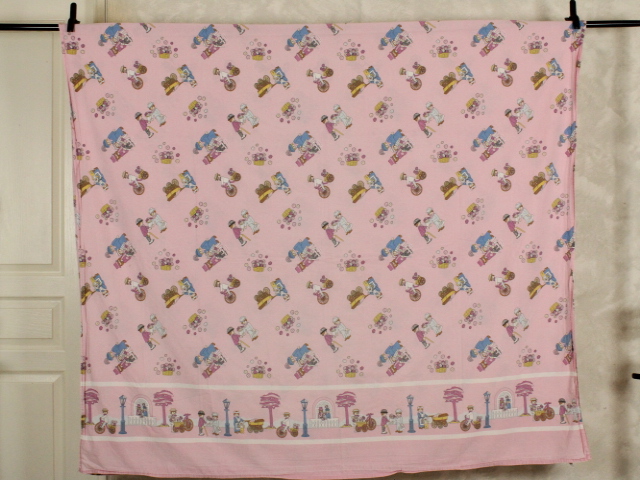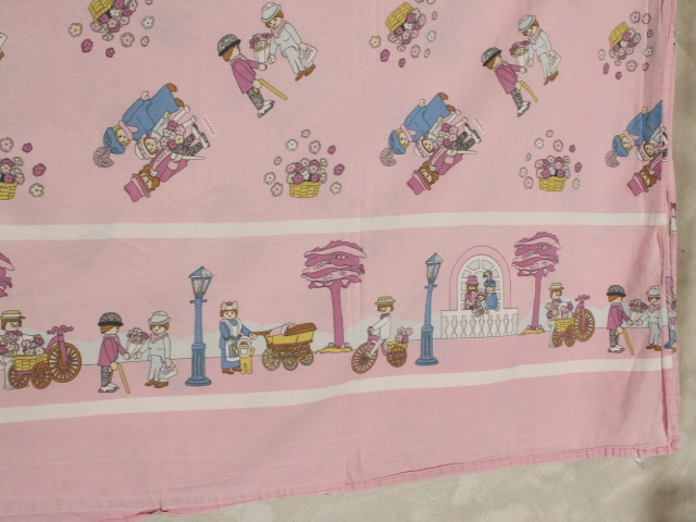 ピンク地に小さなプレイモービルの絵柄が可愛らしい、シングルサイズのフラットシーツです。シーツは1枚もの。全体画像(1,2枚め)はそれぞれシーツを2つ折りにして撮影しています。シーツの下端のみに横並びの絵柄が入っています。