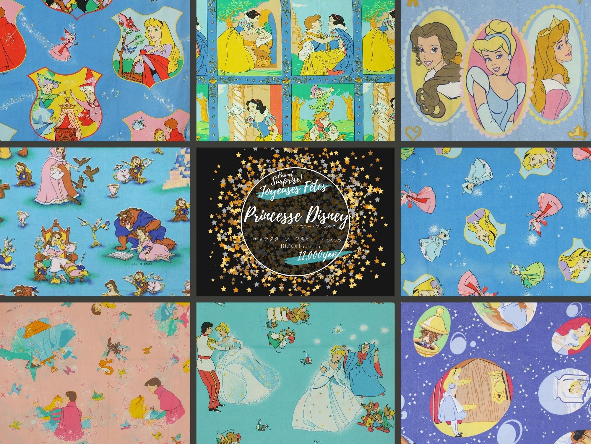 ディズニー、プリンセス、キャラクタービンテージシーツのお楽しみサプライズパックです。画像はイメージで、実際にお届けするものとは異なります。