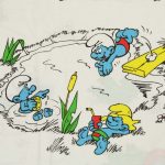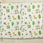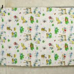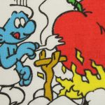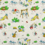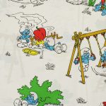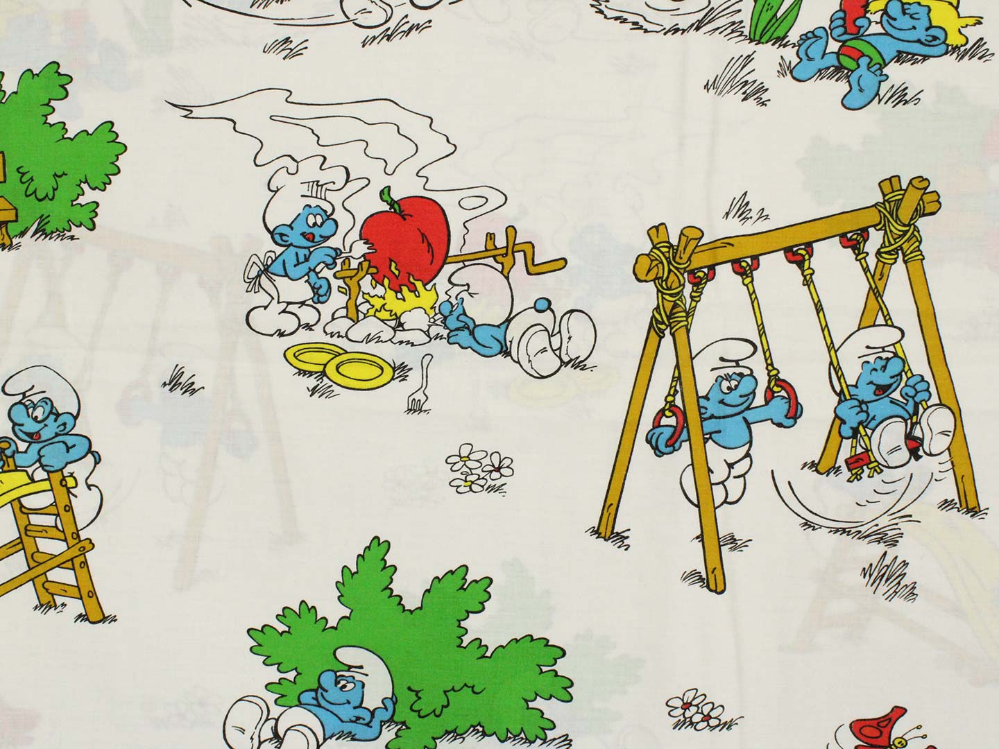 白地に原色カラーがかわいい、スマーフたちのお布団カバー。両面同じ絵柄です。ブランコ遊びや水遊び、焼きリンゴをしているスマーフたち。