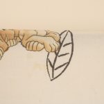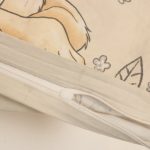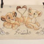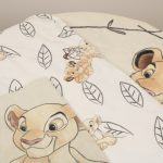 シンバとナラ、白地に葉っぱ柄のベビー〜キッズサイズのお布団カバー&ピローカバーのベッドセットです。チャック式。お布団カバーの片面はシンバとムファサ、もう片面は小さな絵柄のシンバとナラです。ピローカバーは両面同じ絵柄です。