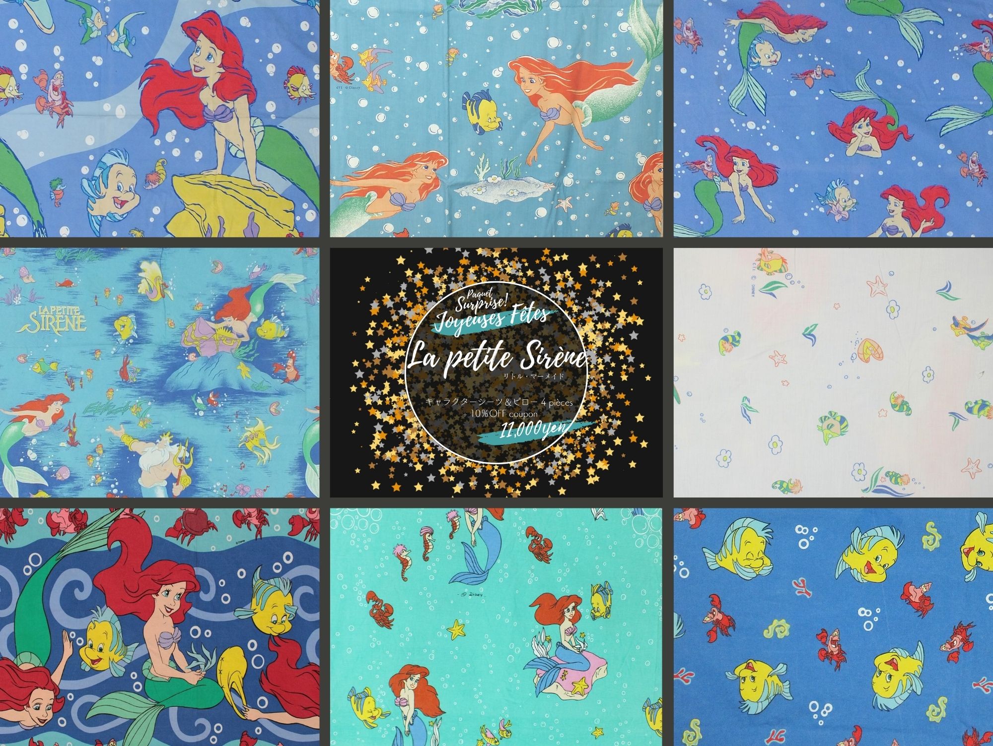 ディズニー、リトル・マーメイド、キャラクタービンテージシーツのお楽しみサプライズパックです。画像はイメージで、実際にお届けするものとは異なります。
