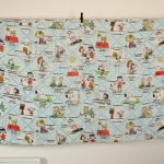 スヌーピーと仲間たち。格子柄背景のフラットシーツです。たくさんのキャラクターが描かれたデザイン。シーツは1枚もの。全体画像(1,2枚め)はフラットシーツを2つ折りにしています。