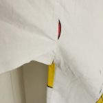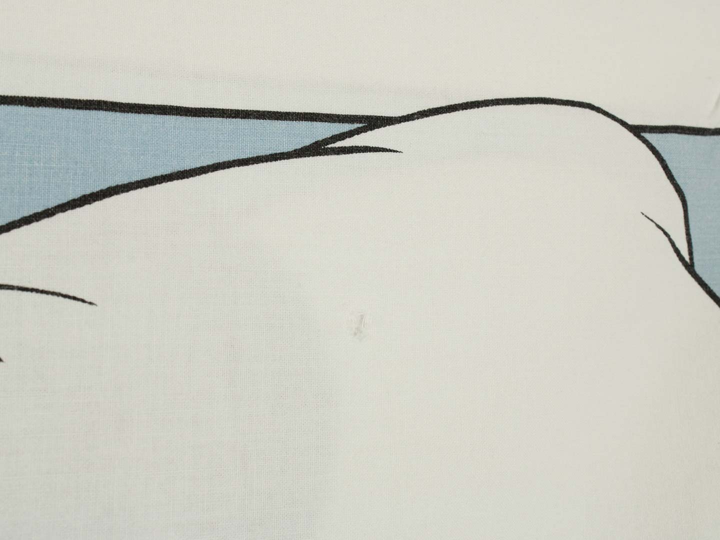 中古品。全体的な軽い色落ち、擦れ、しわなどの使用感があります。下端の折り込み部分が2ヶ所、ほつれています。ピローカバーの1角がほつれています。1ヶ所に小穴があります。