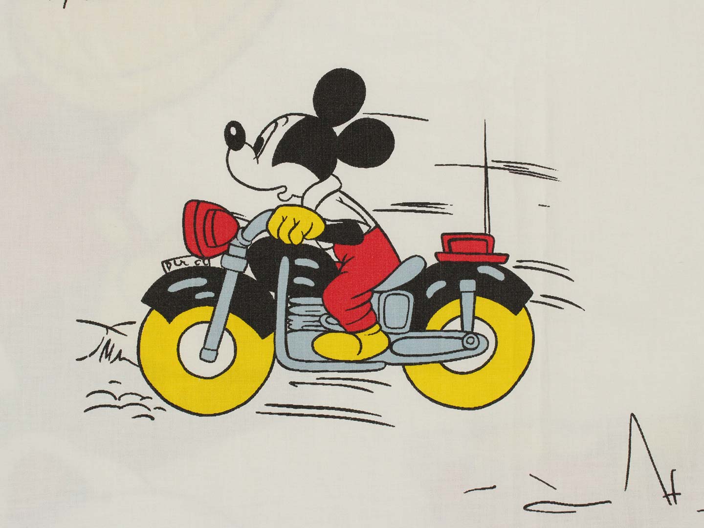 レトロなお顔のバイク&ドライブミッキー。お布団カバー&ピローカバーのベッドセットです。シンプルなデザイン。お布団カバー、ピローカバーともに両面同じ絵柄です。1枚の布で仕立てられており、裏表が上部(折り込み部分が無い方)でつながります。