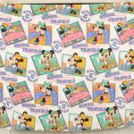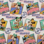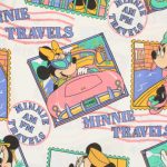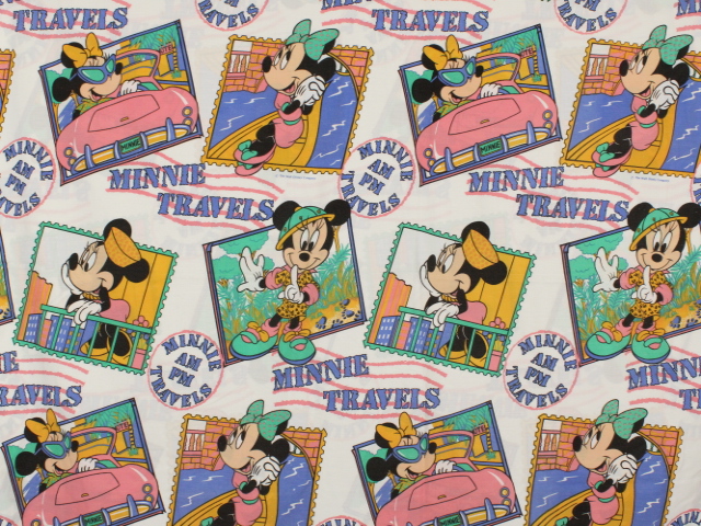 人気のミニー、トラベル切手柄。フラットシーツ&ロングピローカバーのベッドセットです。シーツは1枚もの。全体画像(1,2枚め)はそれぞれフラットシーツを2つ折りにして撮影しています。ピローカバーは裏表別の、大きなミニーのお顔がデザインされています。
