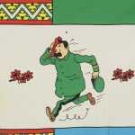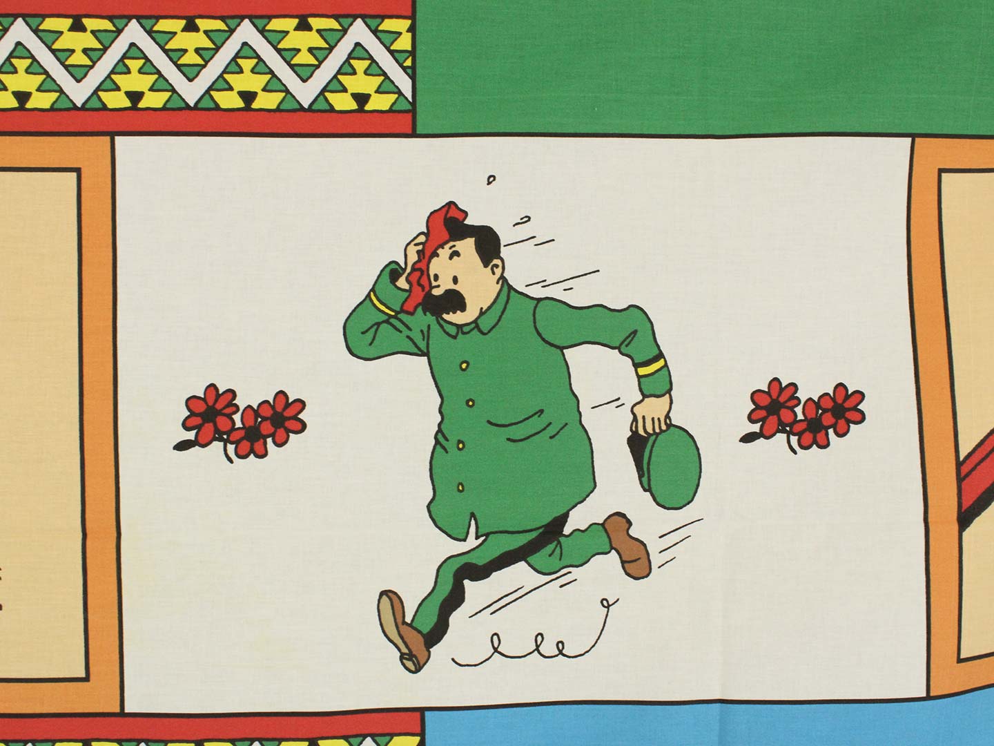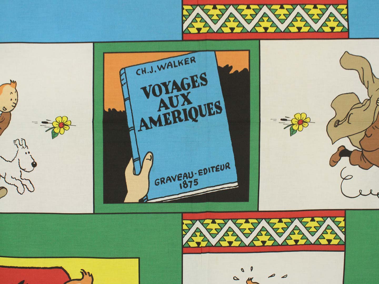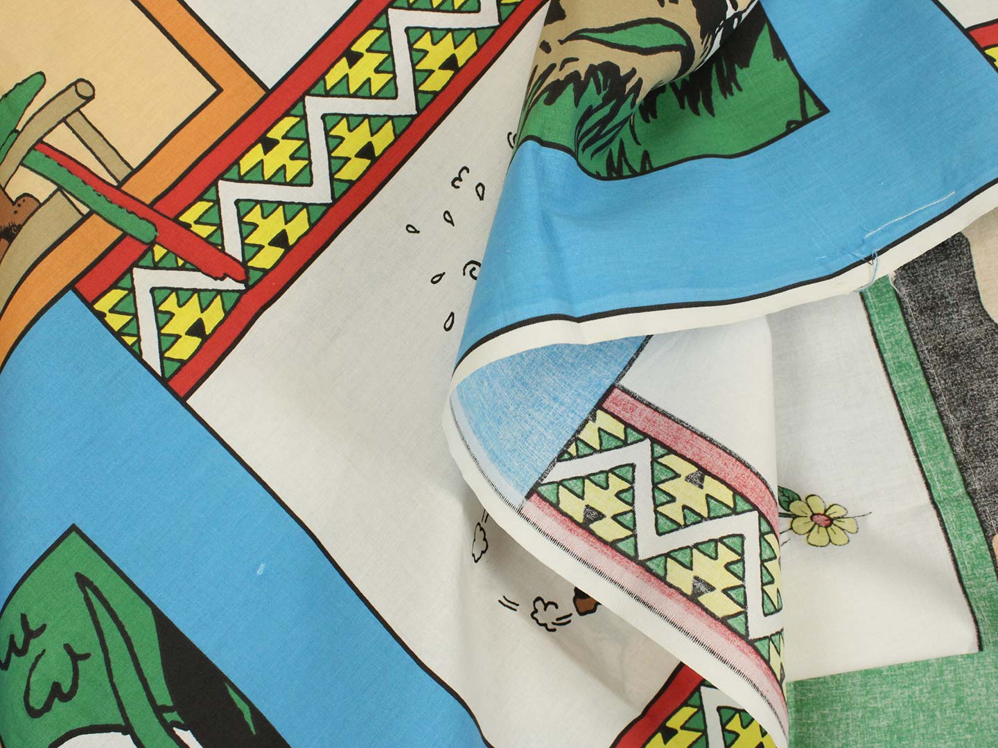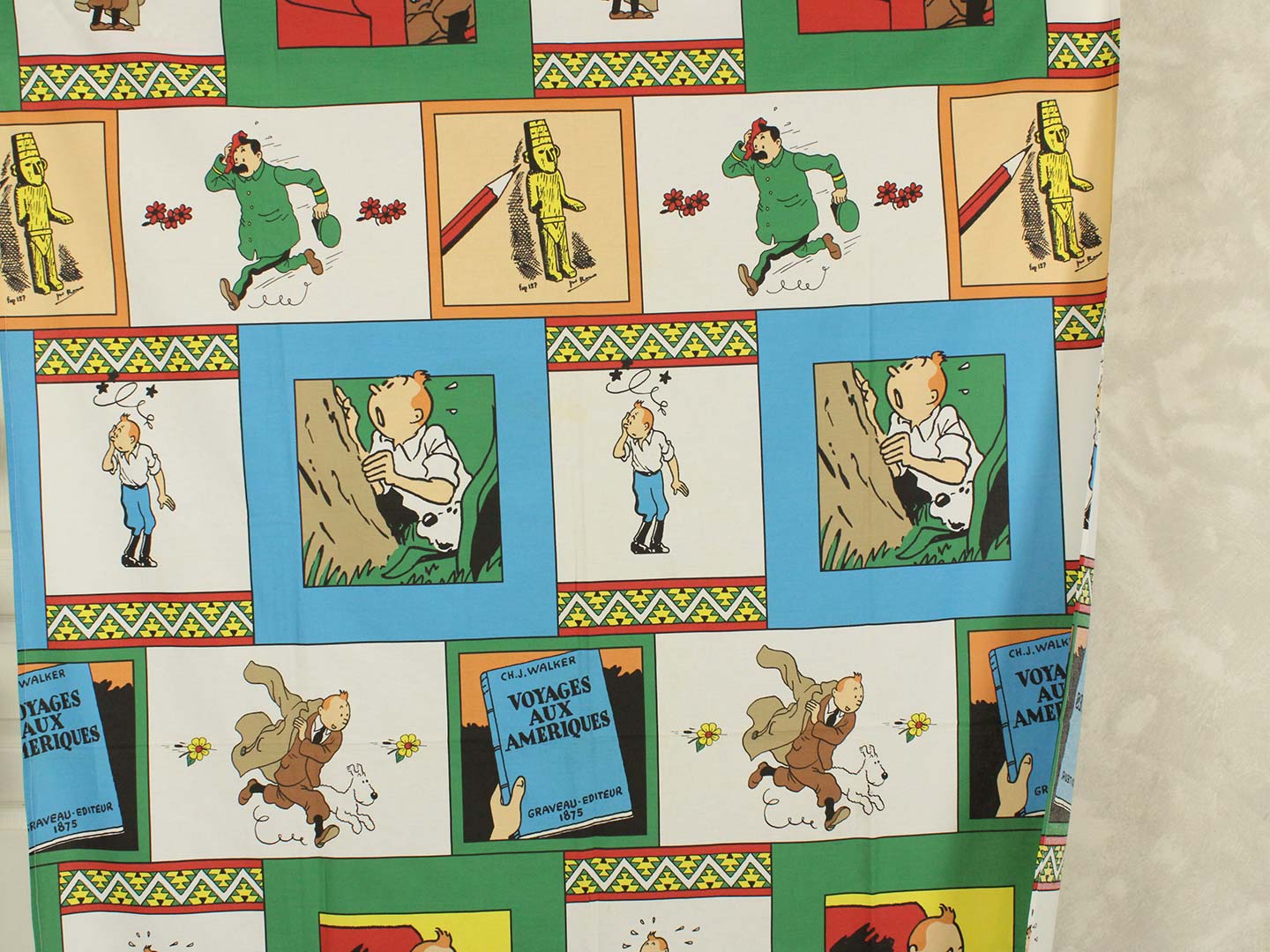 ベルギー発人気漫画、タンタンの冒険シリーズ「Tintin en Amérique」がデザインされたフラットシーツです。シングルサイズよりやや小さめ。画像1枚めが全体です。