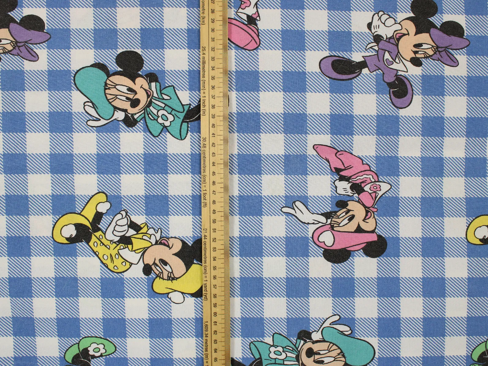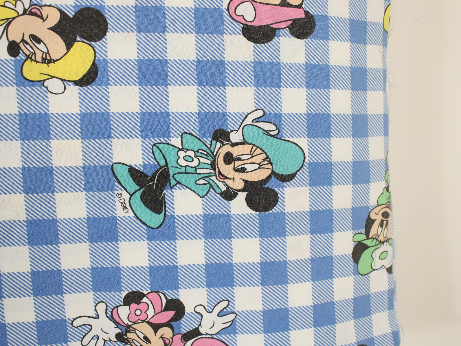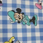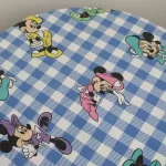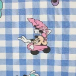 水色ギンガムチェック地にお花の帽子のミニー。