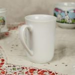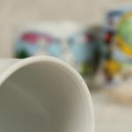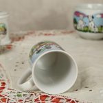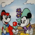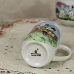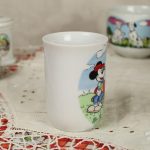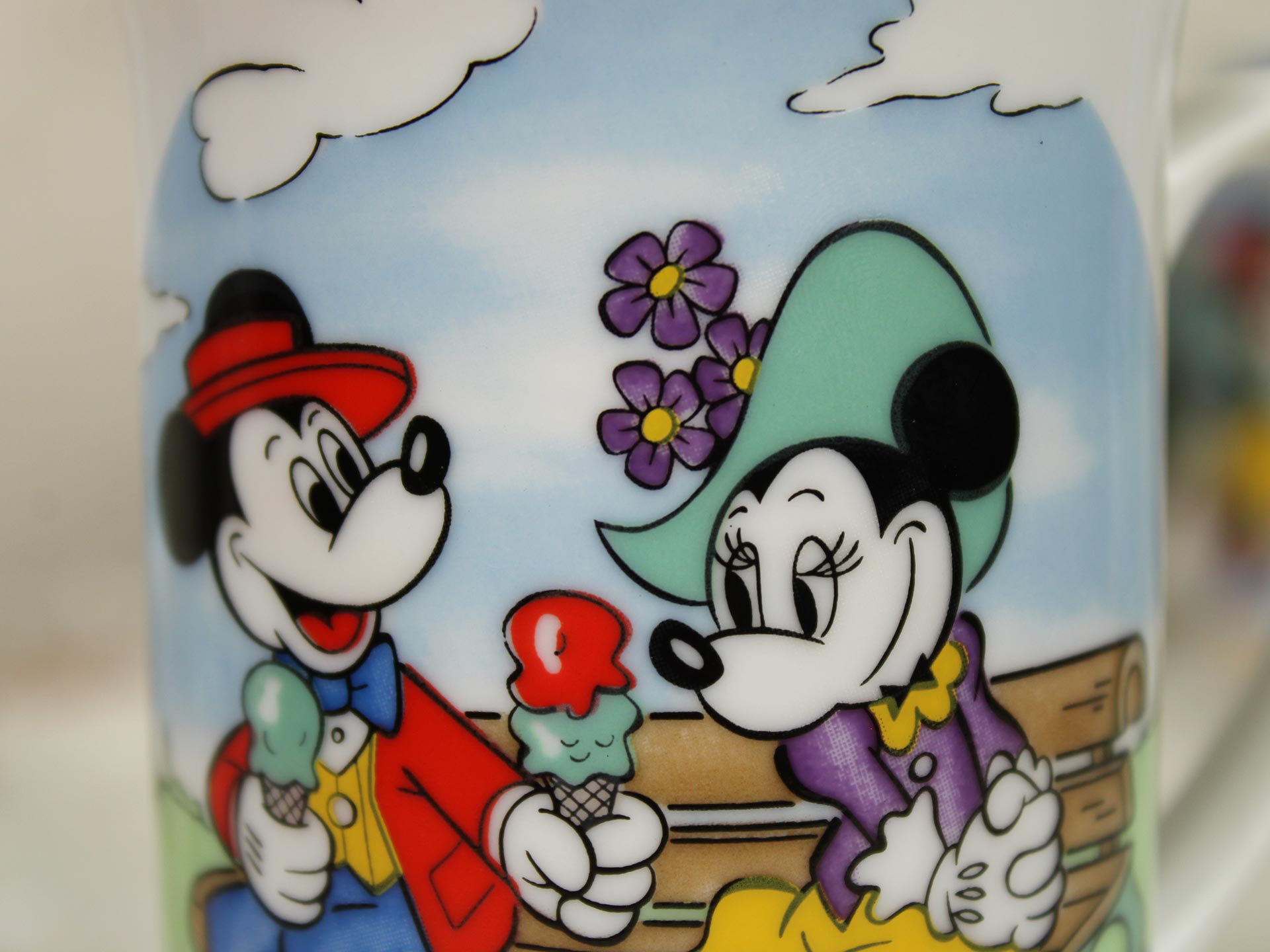 ベンチに座ってアイスクリームを食べるミッキー&ミニーが描かれた磁器製のマグカップ、日本製です。